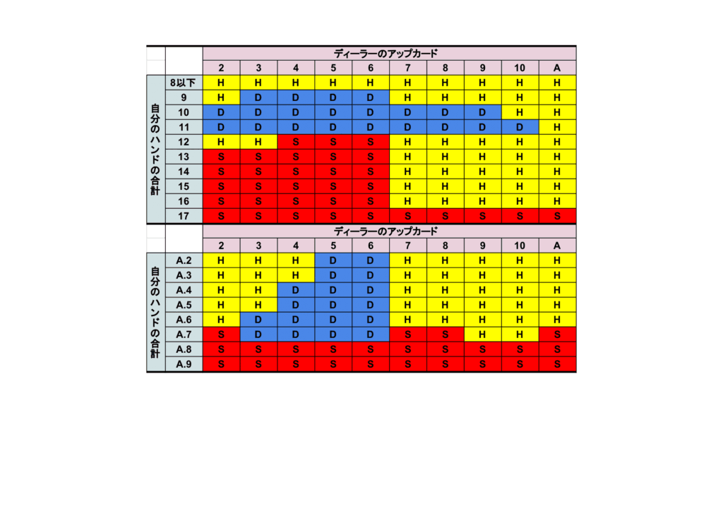 例えば、ディーラーの表カードが「2~6」なら自滅を狙ってステイ、